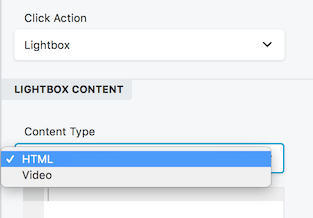 • Click action Link or Lightbox. If you choose Link, a Link field opens for you to enter a typical URL link to another page or location. If you choose Lightbox, a Content type option lets you choose either HTML or Video. For HTML, add any code to display in the lightbox. For Video, a field opens so you can provide a URL for a video from a service such as Youtube or Vimeo.