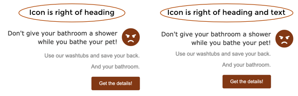 With any of the left or right selections, the icon position is vertically centered with the heading. The difference between Left/Right of Heading and Left/Right of Heading and Text is that with the former, the text and optional button or link are aligned under both the heading and icon, whereas in the latter, the text and optional button remain aligned under the heading, and the icon appears to the left or right of that grouping. The following screenshot shows an example in which the overall alignment (on the Style tab) is set to Right.
