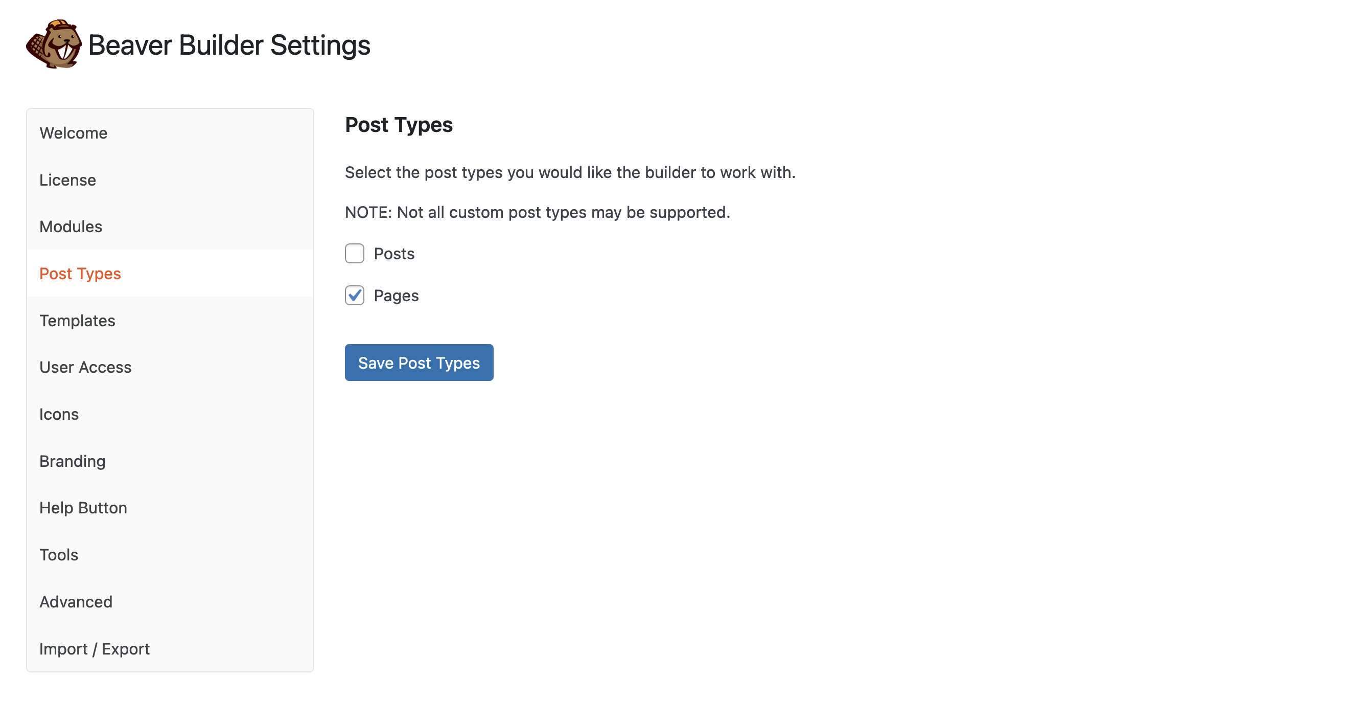 The Post Types tab in the Beaver Builder settings lets you control which post types can use Beaver Builder.