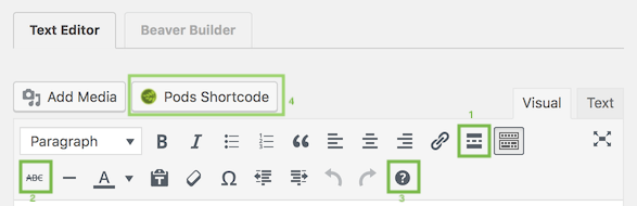 In addition, there can be special buttons or icons on your WordPress editor toolbar for plugins that don't appear in the Beaver Builder text editor. Besides the Pods shortcode button in the previous screenshot, the following screenshot shows some plugin buttons and an icon in the WordPress editor toolbar.