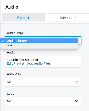 When you choose the Media Library option in the Audio module, click the link to choose one or more audio files to play. You can upload new files at that time also. After you add the audio files, some playback options appear.