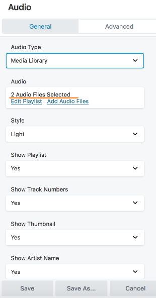 Using the Audio module, you can insert one or more audio files from the WordPress Media Library or a single audio file from an external source, plus choose some playback options.
