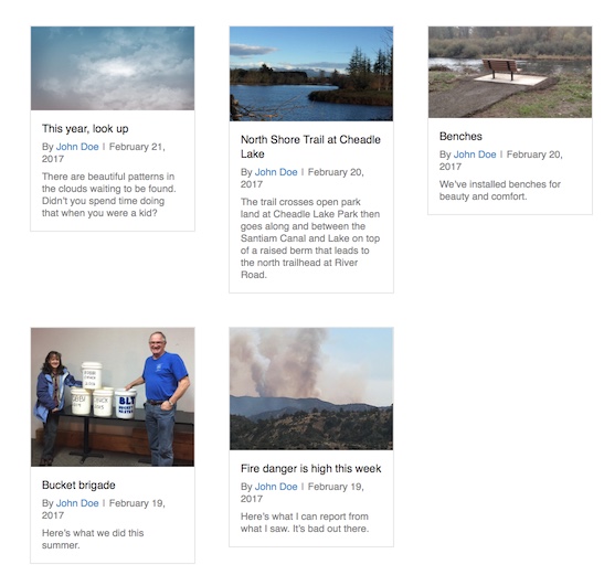 Posts or pages are displayed in top-aligned column groups. In this example, the columns are not set to equal height, so each group is top- aligned, but the bottom borders are adjusted to fit the posts.