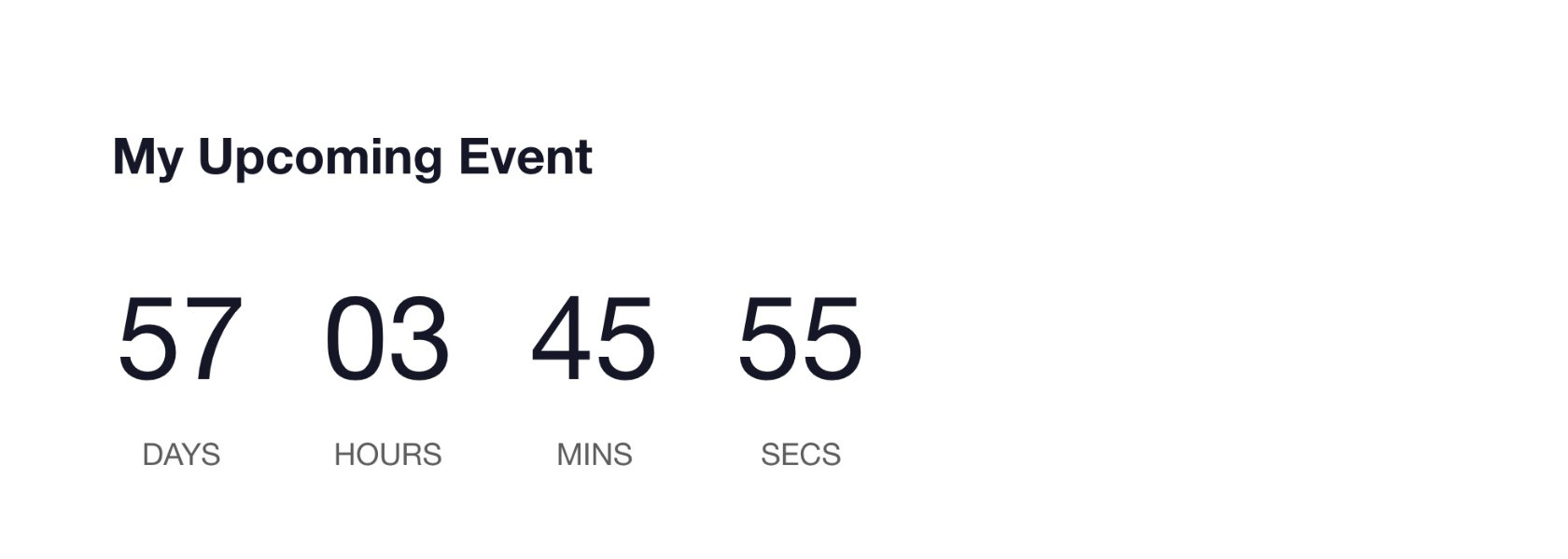 The Events Countdown module allows you to display a published event and show a countdown to the start date of the event. The countdown displays how many days, hours, minutes, and seconds are remaining until the event start date. You can disable the seconds digits from the style tab.