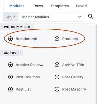 When you edit an Archive-type Themer layout and have the WooCommerce plugin installed, there's a special content category in the Themer modules group of the Content panel called WooCommerce modules. The Archive-type Themer layout has two WooCommerce modules: Breadcrumb and Products.