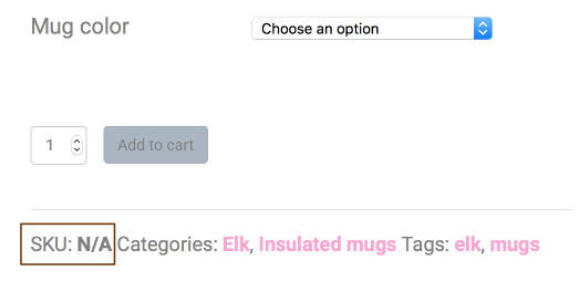 The visibility also behaves the same as the default WooCommerce product meta information. When there is no category or tag set, the Category and Tag labels are not displayed. When there is no SKU number, simple products do not display the SKU label, but when the product has variations, you see "SKU: N/A" instead, as shown in the following screenshot. This is because the main product may not have a SKU number, but there could be one set for one or more variations, which appear once an option is selected.